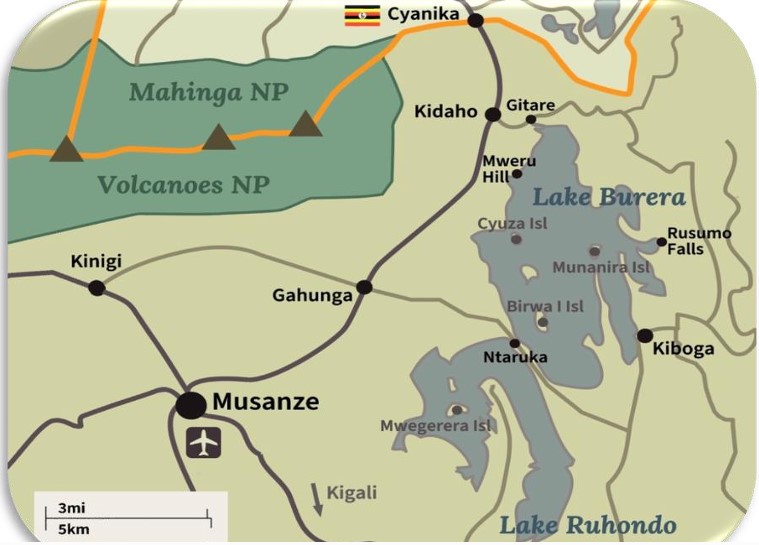 Twin Lakes of Burera and Ruhondo: Formed by volcanic activity at the foot of the Virunga Massif, these scenic lakes are interconnected by the Ntaruka River and surrounded by rich biodiversity. They provide freshwater, support fishing, tourism, and hydropower generation, while also serving as a natural hub for geotourism and environmental education.
