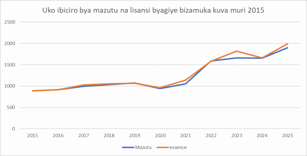 Muri 2022 mazutu yarazamutse igurwa 1,587 Frw lisansi iba 1,580Frw (icyo gihe intambara y’u Burusiya na Ukraine yari irimbanyije), muri 2023 mazutu yari 1,662Frw lisansi ari 1,822, muri 2024 mazutu yari 1652 Frw lisansi ari 1663 Frw, mu gihe uyu mwaka wa 2025 ugiye kurangira mazutu igurwa 1,900Frw lisansi ari 1989Frw.
