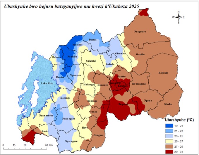 Meteo Rwanda yanatangaje ko muri uku kwezi k’Ukuboza 2025, ubushyuhe bwo hejuru buteganyijwe ku manywa buzaba buri hagati ya dogere Selisiyusi 19 na 31, bukaba buri hejuru gato y’ubusanzwe buboneka mu kwezi k’Ukuboza.